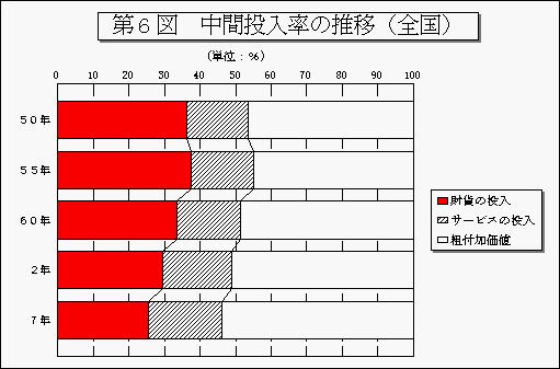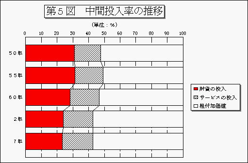 中間投入率を、「財貨の投入」と「サービスの投入」に分けて見てみると、「財貨の投入」が減少する傾向にあり、相対的に中間投入に占める「サービスの投入」の割合は増加している。これは全国の動きと同じである。