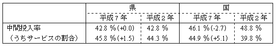 平成7年の産業全体の中間投入率は、42.8%で、平成2年と同じ数値になった。全国を見ると、中間投入率は低下する傾向にあるが、高知県では中間投入率の高い第2次産業の構成比が拡大したため、このような結果となった。