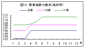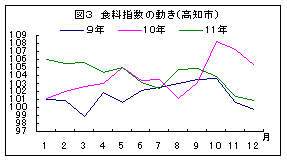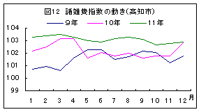 | 1 | 平成11年平均高知市消費者物価指数は、平成7年を100とした総合指数で103.3となり、前年平均に比べて(+)0.2%の上昇となった。 対前年比で上昇した主な要因は、前年に高騰した生鮮野菜の下落や電気・ガス代などの下落があったものの、生鮮食品を除く食料や家賃が上昇したことなどによる。これを10大費目指数の動きでみると、家具・家事用品が(−)2.8%、交通通信が(−)0.9%、光熱・水道が(−)1.2%とそれぞれ下落しているものの、住居が(+)1.4%、教育が(+)2.2%、食料が(+)0.2%、被服及び履物が(+)0.7%とそれぞれ上昇している。 |