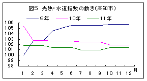 | 光熱・水道指数は年平均で101.4となり、前年平均と比べて(−)1.2%の下落となった。 中分類指数の動きをみると、電気・ガス代は原燃料費調整による値下げにより電気代が(−)1.7%、ガス代が(−)0.8%とそれぞれ下落したため(−)1.4%、他の光熱費は(−)6.7%下落し、指数はそれぞれ99.6、91.7、112.9、99.6となった。 上下水道料は前年と変わらなかった。 |