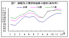 | 被服及び履物指数は年平均で108.5となり、前年平均と比べて(+)0.7%の上昇となった。 中分類指数の動きをみると、シャツ・セーター類は(+)4.9%、洋服は(+)1.4%、下着類は(+)1.3%とそれぞれ上昇し、指数はそれぞれ118.1、109.8、101.1となった。 一方、和服は(−)7.5%、他の被服は(−)2.4%、生地・糸類は(−)0.1%とそれぞれ下落し、指数はそれぞれ98.8、108.7、96.8となった。 被服関連サービスは前年と変わらなかった。 |