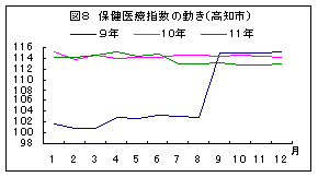 | 保健医療指数は年平均で113.7となり、前年平均と比べて(−)0.5%の下落となった。 中分類指数の動きをみると、保健医療サービスは4月に老人医療の患者負担額の改定があったものの、7月の外来薬剤費の一部負担金にかかる臨時特例措置により(−)0.8%、保健医療用品・器具は(−)1.3%とそれぞれ下落し、指数はそれぞれ127.0、100.4となった。 一方、医薬品は(+)0.8%上昇し、指数は101.5となった。 |